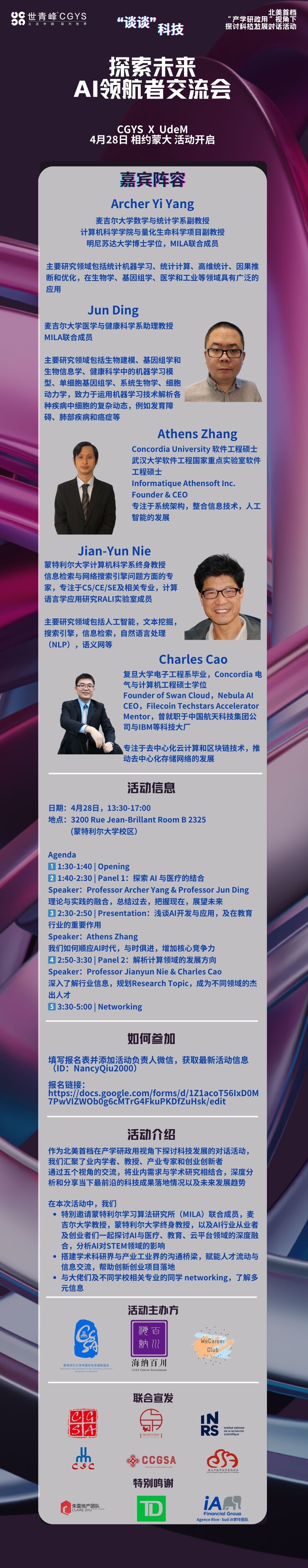 在本次活动中,我们特别邀请蒙特利尔学习算法研究所(MILA)联合成员,麦吉尔大学教授,蒙特利尔大学终身教授,以及AI行业从业者及创业者们一起探讨AI与医疗、教育、云平台领域的深度融合,分析AI对STEM领域的影响搭建学术科研界与产业工业界的沟通桥梁,赋能人才流动与信息交流,帮助创新创业项目落地与大佬们及不同学校相关专业的同学 networking,了解多e元信息